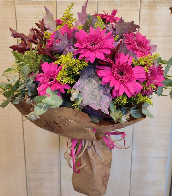 Este ramo de flores de gerberas fucsias y solidago amarillo, acertaras en enviar este ramo de flores por su llamativo contraste de colores.
